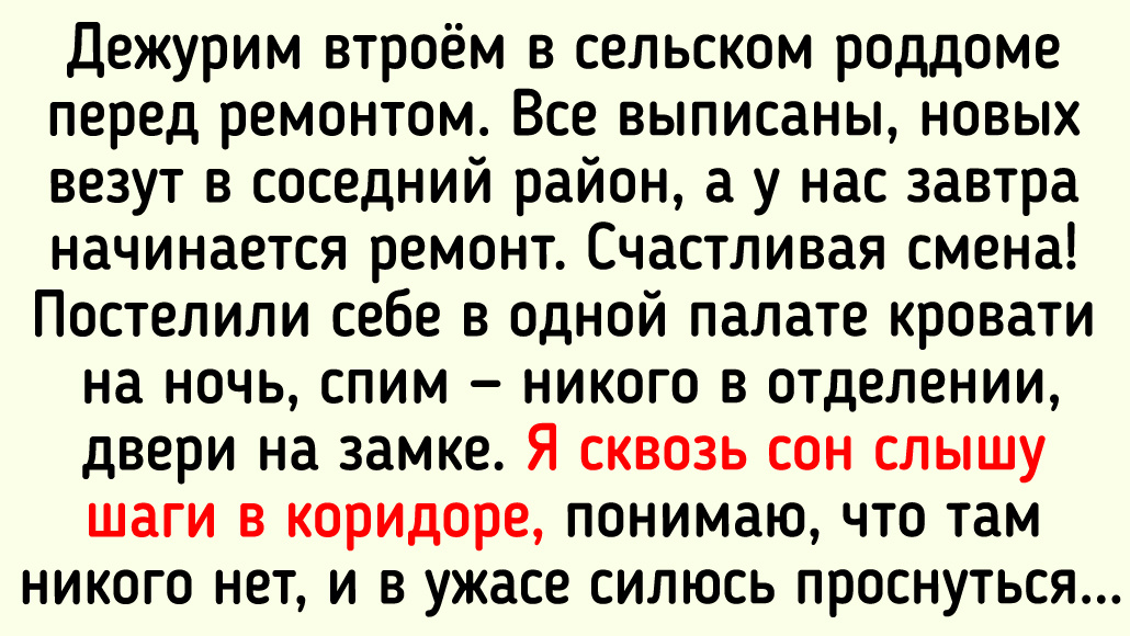 Дежурим втроём в сельском роддоме перед ремонтом. Все выписаны, новых везут в соседний район, а у нас завтра начинается ремонт. Счастливая смена! Постелили себе в одной палате кровати на ночь, спим — никого в отделении, двери на замке.
