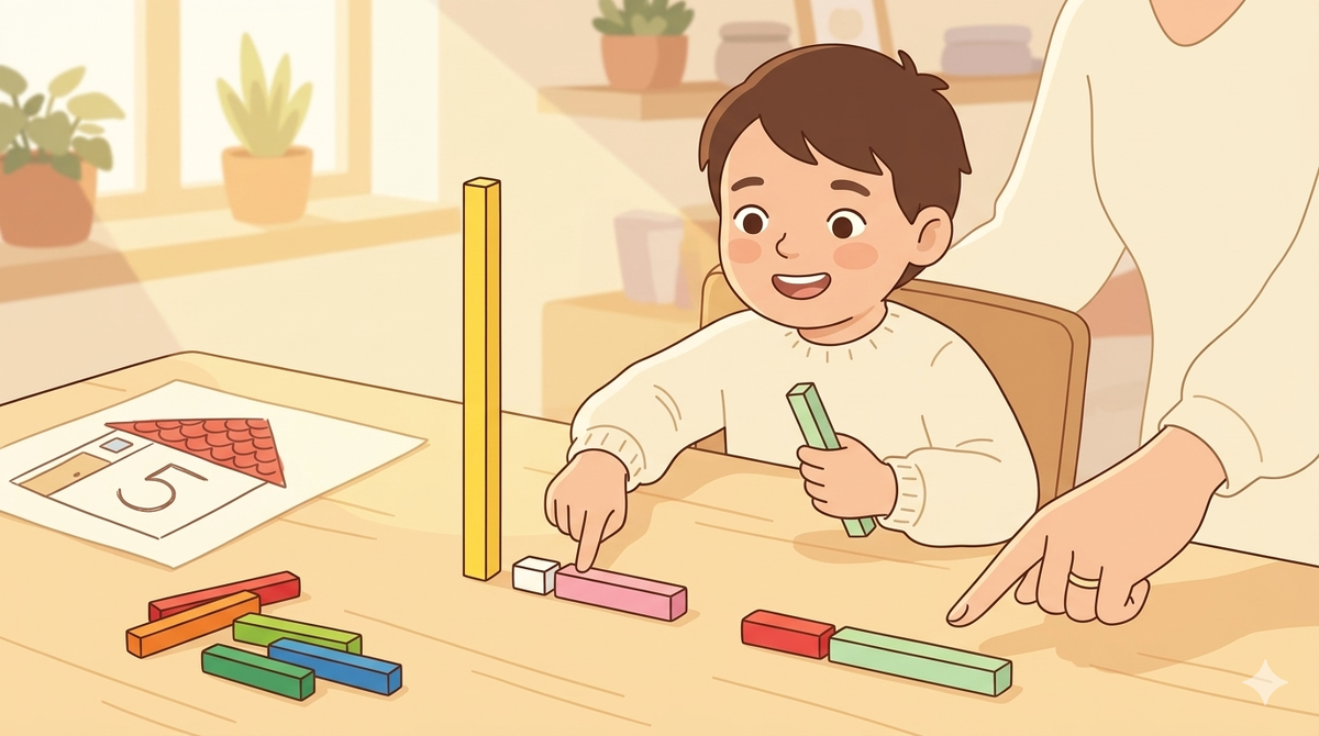 Палочки дают тактильную и зрительную обратную связь. Ребёнок не верит на слово, что 2+3=5 — он видит, что розовая и голубая вместе точно совпадают с жёлтой. Не «примерно», не «учительница сказала», а физически — длина та же. Это формирует уверенность, которую невозможно получить из цифр на бумаге.
