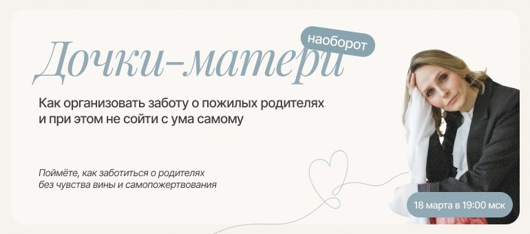 ? Приглашаю вас на бесплатный мастер-класс “Дочки-матери наоборот”, где мы честно и бережно поговорим об этой непростой теме. На мастер-классе вы узнаете: ☘️ О ролевом перевороте: что происходит, когда ребёнок и родитель меняются местами, и как избежать главной ошибки в этой ситуации. ☘️ Об удалённой заботе: как организовать помощь родителям, если вы живёте далеко, с помощью цифровых инструментов и надёжных помощников. ☘️ О сложных отношениях: как взаимодействовать с родителями, если отношения с детства были токсичными, защищать свои границы и при этом сохранять душевное равновесие. Вы получите: ✅ Понимание, как меняются роли и ответственность в семье. ✅ Инструменты для поддержки родителей на расстоянии. ✅ Навыки эмоциональной защиты в сложных ситуациях с родителями Читайте подробную программу https://anastasiyatochilina.ru/dochki-matery?utm_source=tg&utm_medium=kanal С любовью, Анастасия Точилина