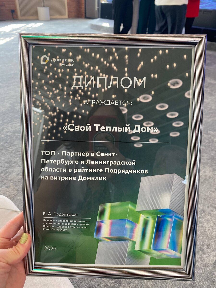 ! 🏆🏡 Сегодня побывали на конференции Сбербанка по ИЖС. Обсуждали самое важное: инструменты Домклик для развития бизнеса, кредитные линии в ИЖС, юридические тонкости в строительстве, кредитные истории и перспективы выставки Open Village в СПБ. Очень полезно и вдохновляюще! Но главное — награда: 🎉 «Свой тёплый дом» вошёл в ТОП-10 подрядчиков СПб и ЛО на витрине Домклик! Для нас эта награда — знак качества и подтверждение надёжности. 🔸 Мы официальный партнёр Сбербанка. 🔸 Работаем на площадке Домклик прозрачно и честно. 🔸 Помогаем с ипотекой и подбираем комфортные решения для каждой семьи. Хотите строить с надёжным подрядчиком, которому доверяют и клиенты, и банк? Приходите к нам! Обсудим ваш будущий дом, посчитаем ипотеку и сделаем всё, чтобы вы въехали в тёплое гнёздышко с удовольствием 🔨✨ 8-800-100-21-75 Info@teplye-doma.ru #СвойТеплыйДом #Домклик #НадёжныйПодрядчик #КаркасныеДома