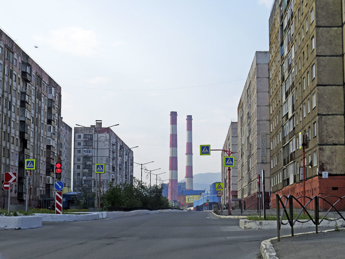 Крайняя в Норильске - Талнахская улица с высокими облезлыми домами 1970-80-х годов: Южным концом она выводит в промзону, где действуют хлебзавод (по качеству - заурядный, но по крайней мере не плохой) и мясокомбинат (чьи самые интересные изделия - колбаса, пиколини и чипсы из оленины, действительно отличные). И ТЭЦ-1, пущенная в 1942 году, а в нынешнем виде, с мощностью 515 МВт и пиковой котельной через улицу, построенная к 1965-му. Автобус едет мимо неё куда-то в Старый город: Талнахская улица на изначальном генплане архитектора Витольда Непокойчицкого значилась просто Восточной линией, а название получила в 1966 году, когда стало ясно, что у Талнахских гор открыт рудный район и освоение его можно наблюдать в реальном времени из окон. В том числе и в наше время - вон вдалеке пущенные в 1974 году Таймырский и Октябрьский рудники и ТЭЦ-3 (1965-69, 425 МВт) рядом с ними: С другой стороны за тундрой и болотами уже всамделишные Путораны накатывают колоссальной волной: