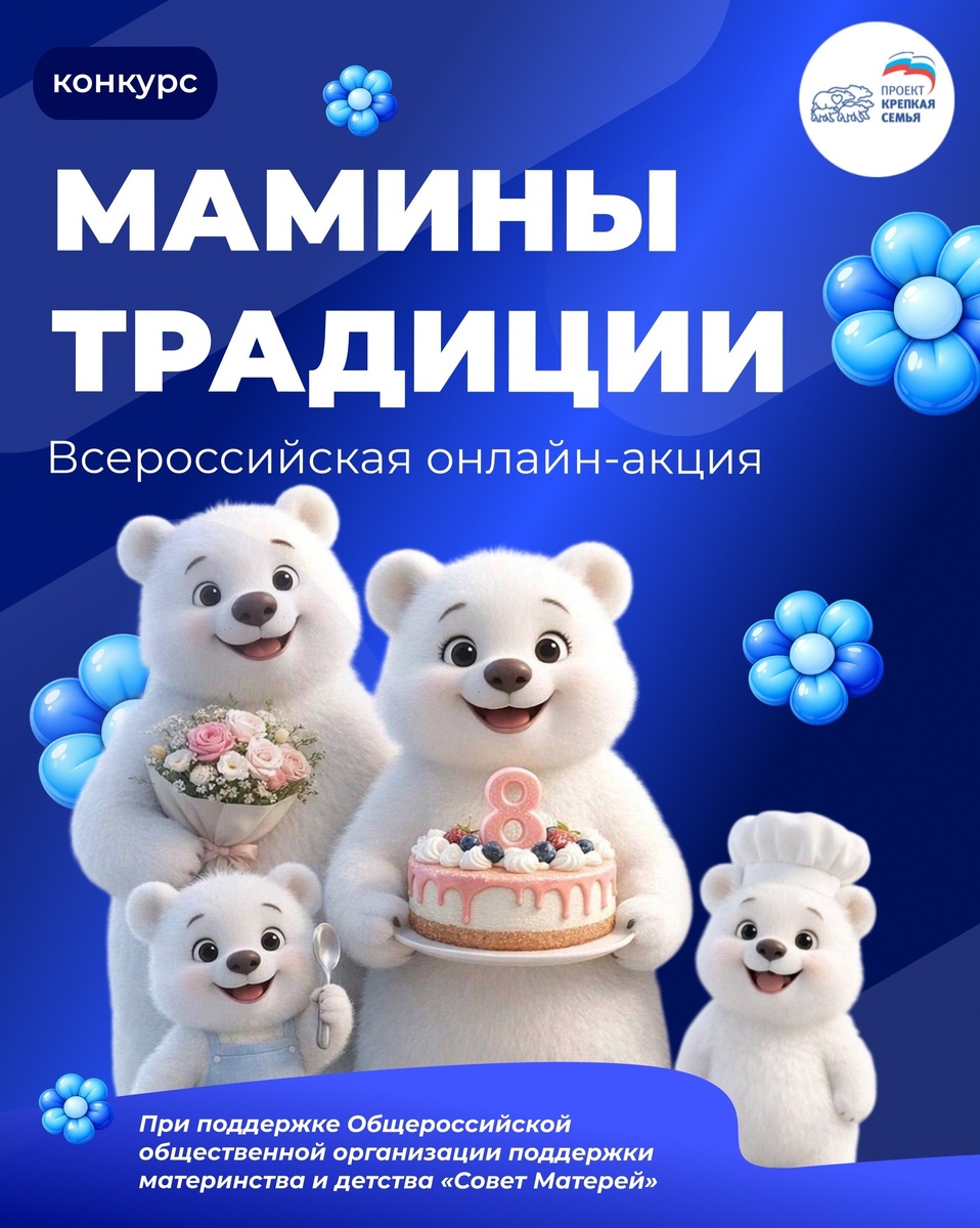 ". 👉 Организатор акции - федеральный партийный проект «Крепкая семья». 💕 Семейные традиции — это невидимая нить, связывающая поколения. Расскажите, какие обычаи появились в вашей семье благодаря маме: создайте фото или видео-историю и поделитесь ею в комментариях к посту об акции на странице проекта "Крепкая семья": https://vk.com/wall-228704072_6962 ❤ Пусть весь мир узнает о том, что делает вашу семью счастливой и крепкой! Как принять участие: ✅ ОБЯЗАТЕЛЬНО подписаться на группы «Крепкая семья» vk.com/krepkaiasemiaer и «Совет матерей» vk.ru/sovetmamas ⭐ Для участия в конкурсе необходимо выполнить ВСЕ вышеперечисленные условия. Работы принимаются до 20 марта (включительно). 👏 Среди всех работ именно ваша может оказаться самой оригинальной и ПОБЕДИТЬ! 📎 Подробности — в положении конкурса: https://drive.google.com/file/ Показать полностью... Присылайте ваши новости в сообщения нашего канала Источник: Открыть