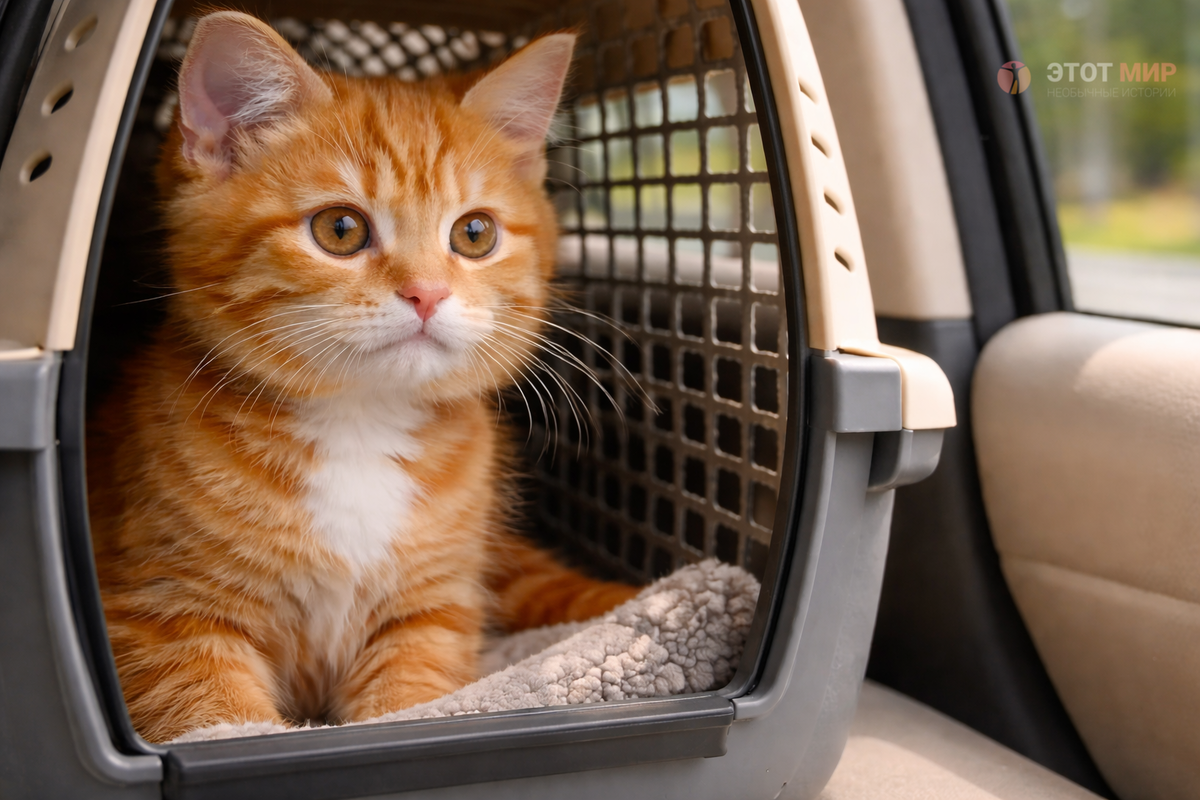 По дороге домой котёнок сидел в переноске и спокойно смотрел через сетчатое окошко, наблюдая за дорогой.