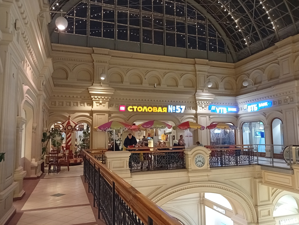 Есть на третьем этаже третьей линии ГУМа отголосок советского общепита. Называется Столовая №57. Рядом еще кафе "Фестивальное", с кухней разных стран и народов мира, но я пока не о нем. Номер пятьдесят семь не просто так присвоен этому заведению. Дело в том, что в 1957 году в СССР случился Первый Международный фестиваль молодежи и студентов, а к этому мероприятию не было приспособлено в центре никакого крупного кафе или столовой. Если чего-то нужного нет, то это надо создать - вот правильный подход. Так появилась эта столовая и кафе рядом. И с тех пор история не прекращается, столовая №57 исправно кормит всех желающих. Меня, например. В тот февральский вечер я замерзла и проголодалась. В России как раз началась Масленица, поэтому атрибутика этого праздника в наличии. А также обычные для столовой салаты и закуски, и прочии снеди. Зона раздачи соседствует с небольшим залом. Мне всегда нравилось, что столы покрыты скатертями, издалека вид как в ресторане, хотя красные подложки немного пор