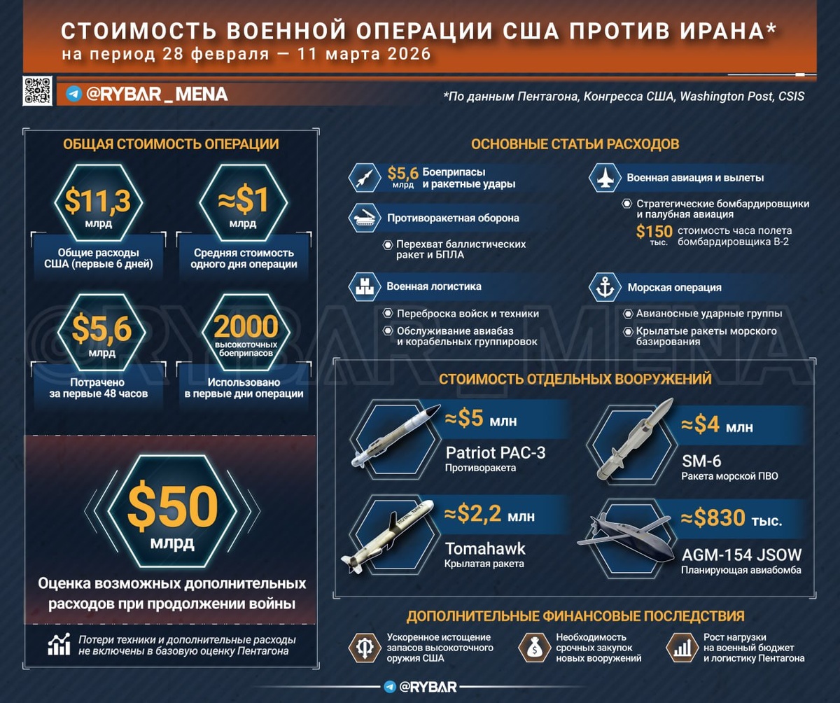 За первые дни ударов по Ирану в США уже потратили порядка десятка млрд. долларов. По данным Пентагона, Конгресса США, а также оценкам аналитических центров и американских СМИ, только в первые дни операции расходы достигли $11.3 млрд. Причём большая часть суммы была потрачена буквально за двое суток. В первые 48 часов операции на удары, вылеты авиации и морские пуски ушло около 5,6 млрд долларов. В дальнейшем темп расходов стабилизировался примерно на уровне $890 млн — $1 млрд в сутки. При этом речь идет о прямых затратах на боевые действия с учетом стоимости уже произведенного вооружения. Потери техники и заказы на восполнение арсеналов сюда не входят. 🔻На что уходят деньги? 🔸Главная статья расходов — боеприпасы, на которые уже ушло $5,5–5,6 млрд. В частности, за первые дни операции было израсходовано более 2000 крылатых ракет и управляемых авиабомб. 🔸Значительную часть бюджета также съедает авиация. В операции участвуют стратегические бомбардировщики, палубная авиация и самолёты п
