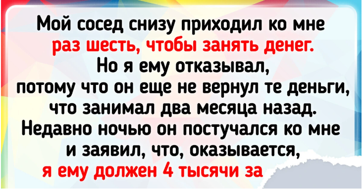 - Мой сосед снизу приходил ко мне раз шесть, чтобы занять денег. Но я ему отказывал, потому что он еще не вернул те деньги, что занимал два месяца назад. Недавно ночью он постучался ко мне и заявил, что, оказывается, я ему должен 4 тысячи за аренду — за то, что на его стенах держится моя квартира!