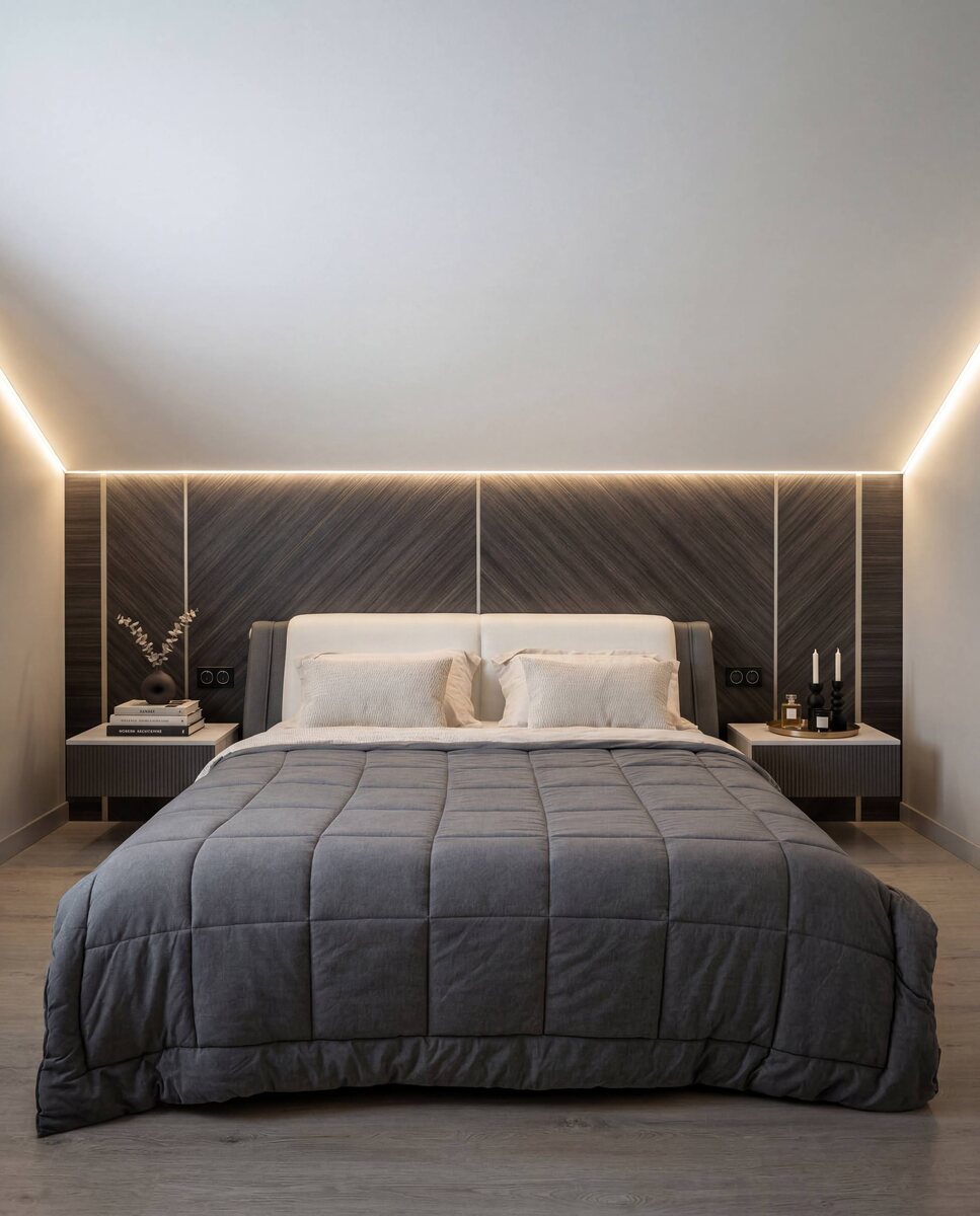 ? 📷 Работа над этим проектом для MebeLi-TO стала отличным примером того, как нестандартный подход к материалам меняет восприятие всей комнаты. ➡️ Перед нами стояла задача: интегрировать темный акцент в светлую спальню так, чтобы сохранить ощущение простора: ✔️ Мы перевернули привычный рисунок материала, превратив панно в центральный арт-объект. ✔️ Вертикальная фрезеровка фасадов и металлические вставки создают четкий ритм, который визуально «вытягивает» пространство. ✔️ Правильно подобранный темный оттенок не уменьшил габариты помещения, а добавил ему камерности и стиля. 📎 Результат - современная спальня с характером, где каждая деталь на своем месте. _______________ Получить онлайн консультацию Рассчитать стоимость проекта Записаться в салон