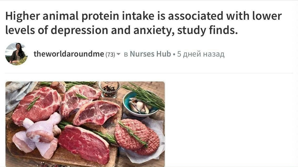 Особенно это заметно у людей, которые едят много мяса. Выяснилось, что те, кто употребляет больше мяса, на 27% реже страдают от тревоги и депрессии. У женщин эта связь проявляется особенно сильно — риск психических расстройств снижается на 40%. Учёные объясняют этот эффект наличием в мясе аминокислот, которые участвуют в выработке серотонина и напрямую влияют на настроение. Привет всем мясоедам! А остальным желаем крепкого здоровья!