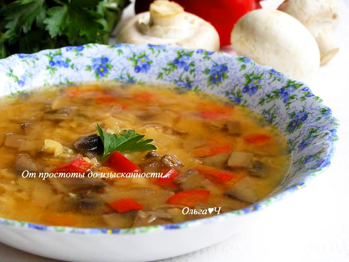 петрушка для подачи Приготовление: Горох замочите на ночь, затем поставьте вариться с добавлением лаврового листа на 1 час. Тем временем на растительном масле обжарьте нарезанные лук, морковь и сладкий перец. Добавьте грибы и обжарьте все вместе около 10 минут. За 20 минут до окончания варки гороха, добавьте овощи с грибами в кастрюлю с горохом, перемешайте, посолите, поперчите. Готовый суп разлейте по тарелкам, посыпьте рубленной петрушкой и подавайте. Приятного аппетита! Вам также могут понравиться: