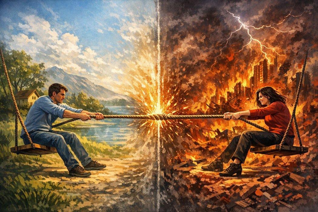 Иллюстрация 2: Привычный способ решения конфликтов — избегание — перестает работать с новым партнером. Человек пробует избегать по-новому: уходит не на кухню, а в спальню, но сути это не меняет.