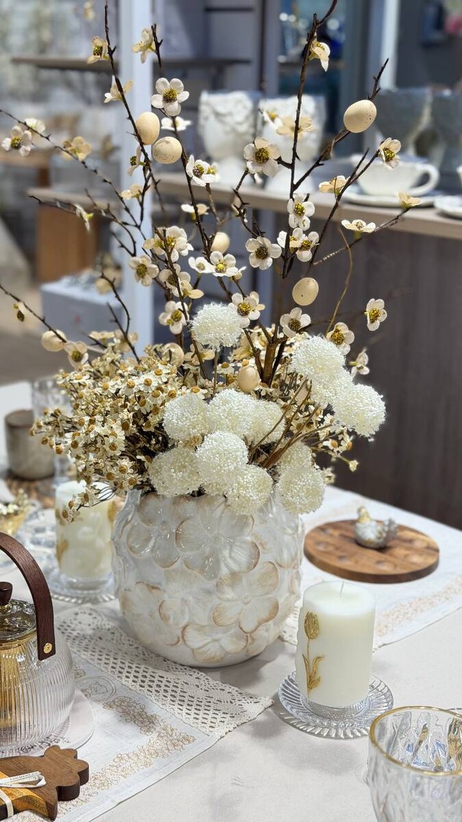 Сервировку в Кухенленде невозможно представить без ваз и букетов. Это неотъемлемая часть стиля магазина. Жёлтая ветка в вазе очень хороша. Рядом стеклянное блюдо на стеклянной ножке. Из-за наполнения его плохо видно. Очень красивое. Похоже на хрусталь. Размер 30*12 см. Ваза на фото справа мне понравилась. Она молочного оттенка. Сделана из фарфора. Размер 22 см.