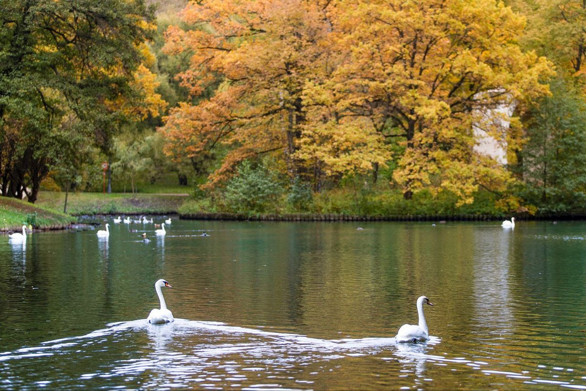 На Голицынском пруду Парка Горького живут белые и черные лебеди (например, пара Одетта и Зигфрид).