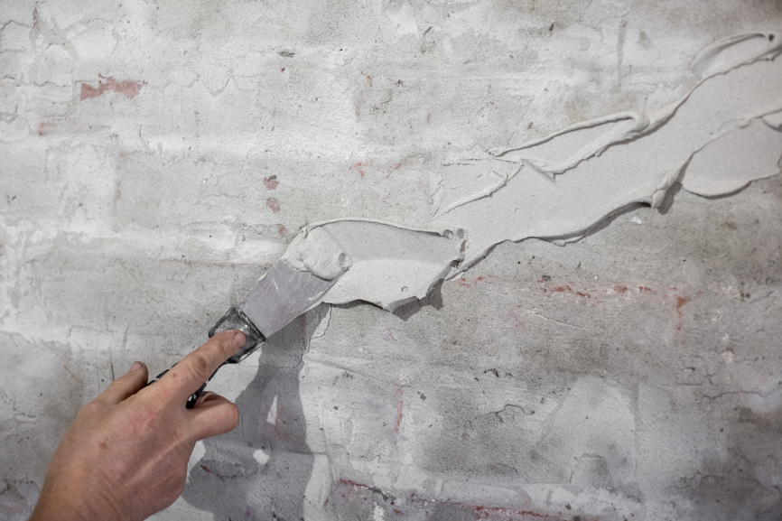 С помощью шпателя и металлической щетки удалите все осыпающиеся и слабые участки штукатурки. Трещины необходимо расшить (увеличить) до V-образной формы на глубину 5-10 мм. Это обеспечит лучшее проникновение и закрепление ремонтного состава. После механической обработки поверхность тщательно обеспыливают.