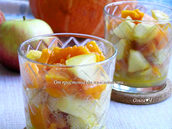 1 ст. л. растительного масла Приготовление: Тыкву нарежьте кусочками, потушите на растительном масле около 5-7 минут. Добавьте нарезанное яблоко. Тушите вместе ещё около 5-7 минут до мягкости. Разложите десерт по креманкам/чашкам и подавайте в теплом виде, посыпав коричневым сахаром по вкусу. Приятного аппетита! Вам также могут понравиться: