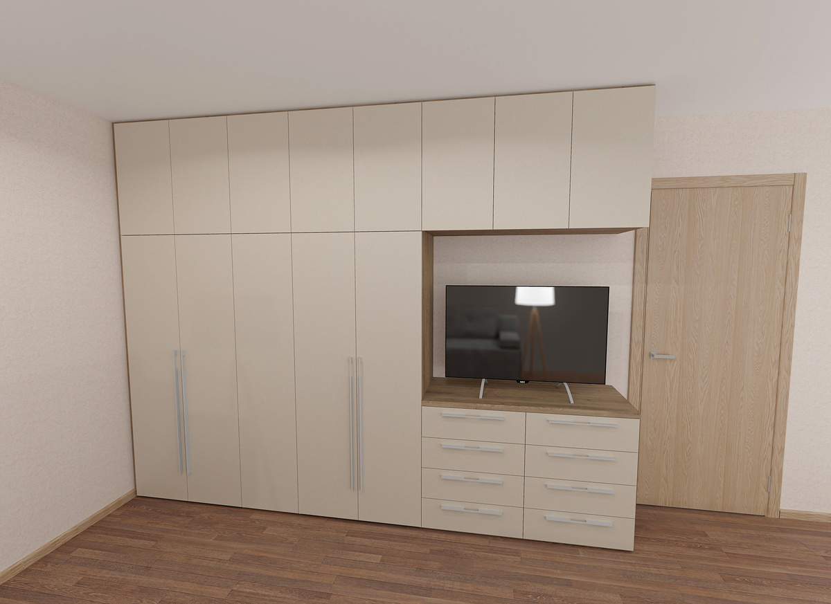 Вот такой попросили изобразить и посчитать стоимость. Шкаф обычный, ничего в нем особенного нет и смотрится он скучно конечно. В комнате примерно такой ламинат и бежевые стены. Дверь межкомнатная под дерево, как я изобразил. Комната пустая, привязаться к какому то цвету не получается, поэтому шкаф по умолчанию тоже сделал бежевым. Штанги не просили, нужно много полок.