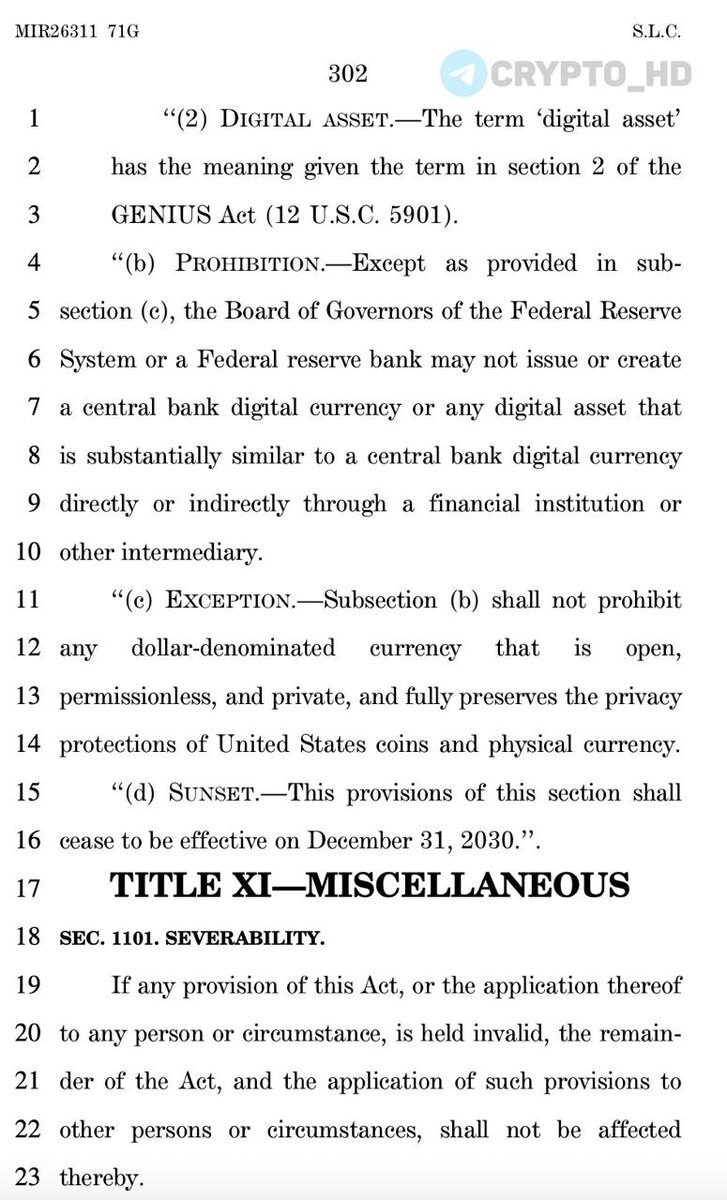 🔥🇺🇸 Сенат США принял законопроект, который запрещает ФРС выпускать CBDC до 31 декабря 2030 года