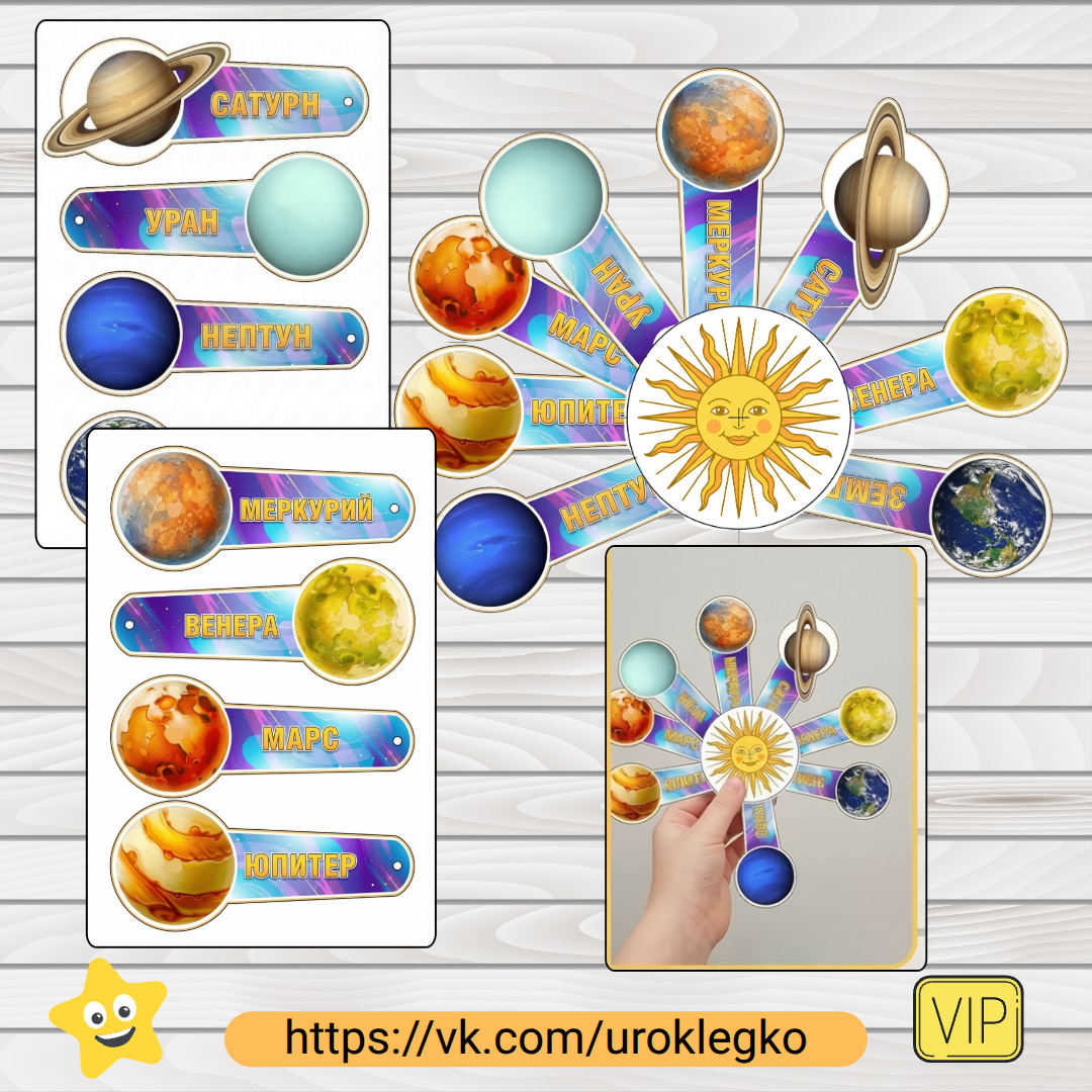Набор из 3 листов А4, которые нужно просто распечатать на цветном принтере. Всё уже продумано: яркие, сочные планеты с их названиями!