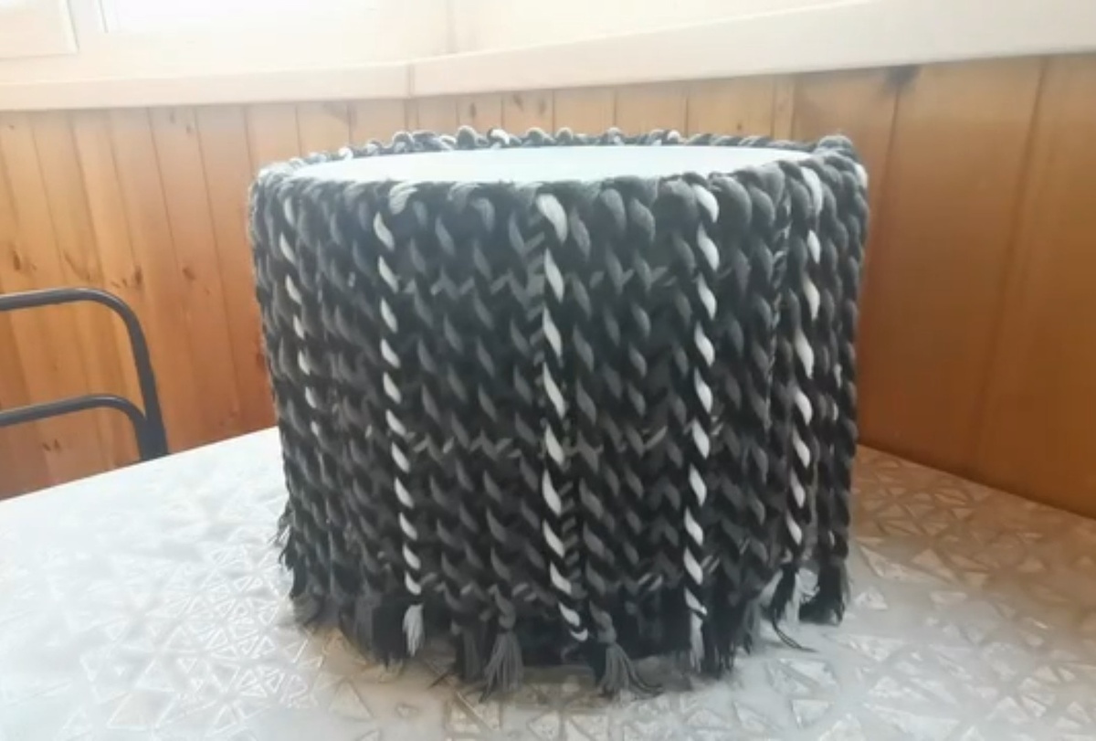 Когда-то давно был у меня шарф с длинной бахромой. Я его очень любила и активно носила, пока на нем не стали появляться затяжки, которые меня раздражали. Поэтому им я декорировала ведро. Получился теплый органайзер для овощей.