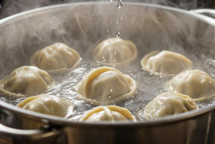 Этот метод в древнем Китае назывался Диань шуй. Что в переводе означает точечная вода. На деле, как только пельмени всплывали на поверхность, врачи добавляли в кипяток стакан холодной воды. Блюдо продолжало готовиться равномерно, не образуя клейкую массу. А учитывая, что раньше готовили на огне, это было просто необходимо.