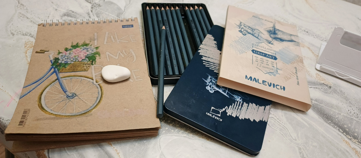 И так начала я свой путь простого карандаша с того, что приобрела рабочий матерьял, набор карандашей, ластик и блокнот для рисования.
