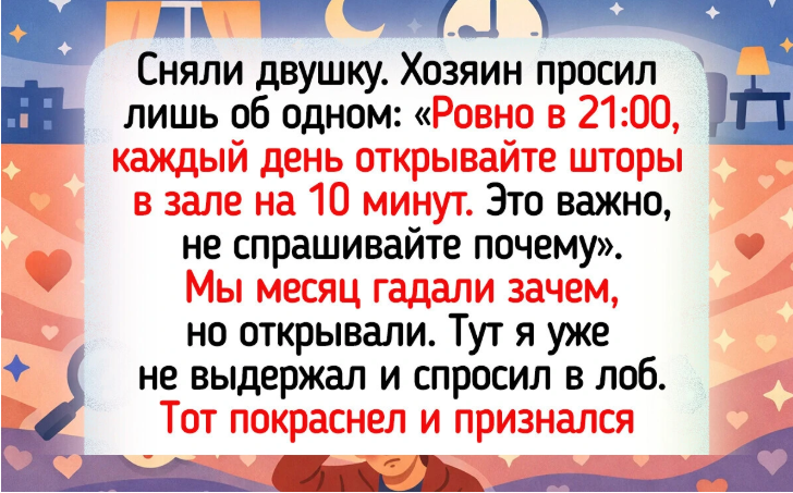 - Сняли двушку. Хозяин просил лишь об одном: «Ровно в 21:00, каждый день открывайте шторы в зале на 10 минут. Это важно, не спрашивайте почему». Мы месяц гадали зачем, но открывали. Тут я уже не выдержал и спросил в лоб. Тот покраснел и признался: «Понимаете, напротив живет моя мама. Если шторы открываются — значит, у меня (то есть в ее понимании — у меня) все хорошо, я жив-здоров. А если не открыть — она прибежит через 5 минут. Я просто не сказал ей, что сдал квартиру, чтобы она не волновалась».