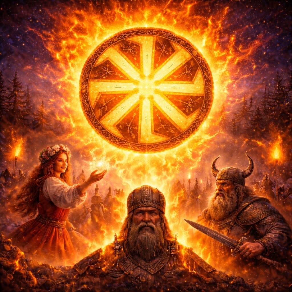И речь здесь не только о бытовом огне печи и не только о костре. Речь о большом огне мира. О солнце. О молнии. О жаре жизни. О внутреннем пламени человека. О той силе, которая не терпит застоя, не любит гниения и всегда требует движения. Если убрать все поздние споры, современные искажения, страхи, политические нашлёпки и дешёвую псевдоисторическую шелуху, останется простая и очень древняя вещь: Коловрат связан с огнём потому, что он изображает не покой, а вращающуюся силу света.