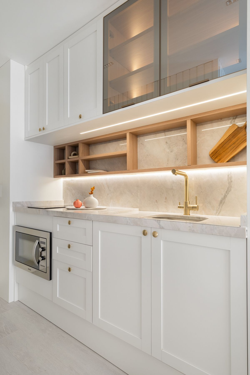 На этой кухне белые фасады с лёгкой филёнкой (shaker light) в тёплом оттенке off-white (близко к RAL 9010) формируют спокойную базу без резкого контраста. Верхний ряд комбинирован: глухие модули и витрины с тонированным стеклом, интегрированная внутренняя подсветка добавляет глубину и снижает визуальный вес.