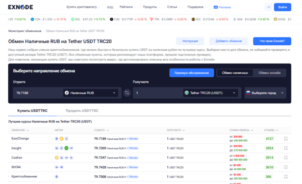 Чтобы упростить поиск надежных сервисов, многие используют мониторинги обменников, например Exnode — платформу, где собраны проверенные криптообменники, актуальные курсы и резервы валют.