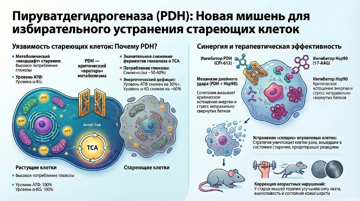 Данное исследование обосновывает статус пируватдегидрогеназы (PDH) как фундаментальной мишени для сенолитиков нового поколения. Выявленная метаболическая уязвимость стареющих клеток — как нормальных, так и опухолевых — позволяет реализовать стратегию селективного уничтожения через биоэнергетическое истощение.