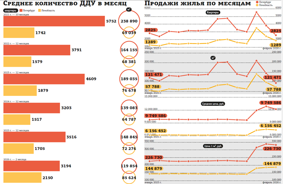 По данным Dataflat, в Петербурге в феврале было заключено 2569 договоров долевого участия (ДДУ). Это на 33% меньше, чем в январе, и на 36% меньше декабрьского пика. В Ленинградской области зарегистрирован 1871 ДДУ, снижение к январю составило 23%. Суммарно по агломерации рынок потерял треть объёма продаж за один месяц. Если же брать за точку отсчёта декабрь 2025–го — один из самых сильных месяцев в истории наблюдений (5563 сделки на 210,36 тыс. м2), — то падение выглядит катастрофическим: –54% по количеству и –55% по площади.