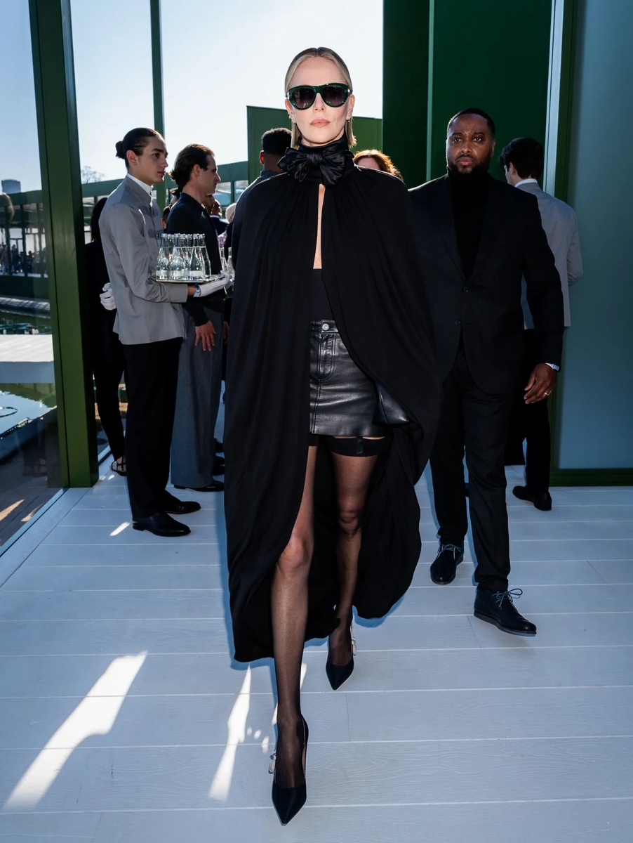 Шарлиз Терон - американская актриса кино, телевидения и озвучивания, кинопродюсер и фотомодель южноафриканского происхождения появилась на фэшн-показе в образе total black. 50-летняя актриса смотрелась весьма эффектно! Блондинка выбрала кожаную мини-юбку(!), топ и накидку с бантом на шее. Особого внимания заслуживают черные полупрозрачные чулки на подвязках и черные лодочки на шпильке. Взгляд мужчины на заднем планет фото говорит о многом! Полюбуемся once more: