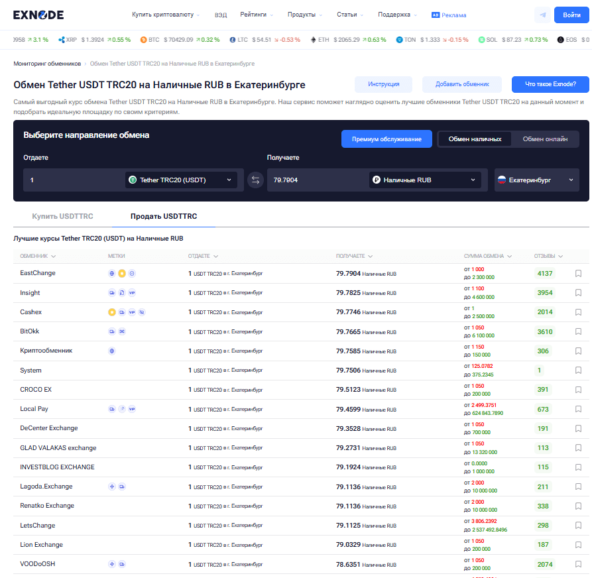 Наиболее удобный способ — воспользоваться специализированными агрегаторами. Например, мониторинг Exnode собирает информацию о том, какие криптообменники Екатеринбурга работают в городе, какие направления обмена они поддерживают и какие отзывы оставляют реальные пользователи.