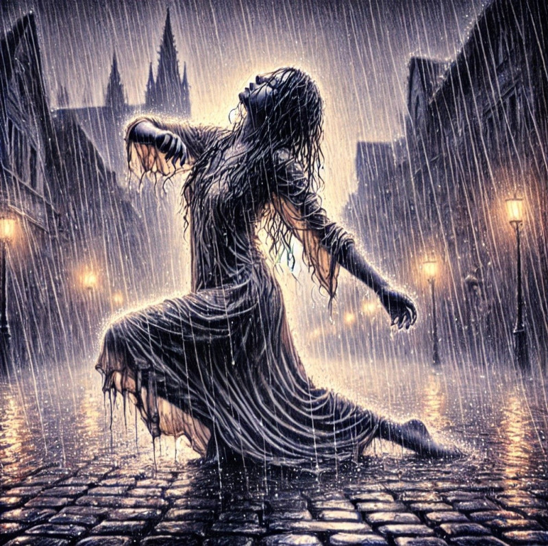 Начался дождь, но её танец продолжался. Лицо Эльзы, влажное от пота, умывалось каплями дождя, длинные волосы прилипли к телу. Тёплая вода стекала по плечам, а от туфель, пропитанных кровью, по мостовой растекалось красное пятно. Мокрый подол платья бесстыдно обтягивал ноги, но она не останавливалась. К ночи, совершенно обессилев, Эльза упала прямо на мостовую, но не успели первые розовые лучи рассвета коснуться башен города, как женщина поднялась и вновь начала плясать.