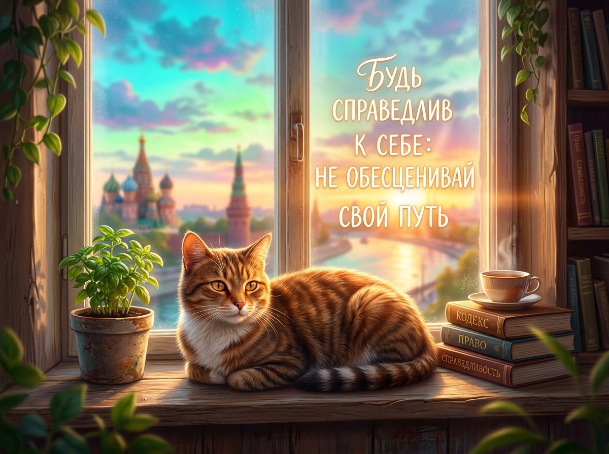 день. Как рассвет мягко отталкивает ночь, так и ты можешь отодвинуть сомнения и начать с малого шага к тому, что важно именно тебе. Сегодня, в День юриста в России, я думаю о справедливости и хочу, чтобы ты был справедлив в первую очередь к себе: не обесценивай свой путь, свои старания, свои тихие победы. Позволь себе двигаться в собственном ритме, как кот, который уверенно выбирает, куда поставить следующую лапу. Мир сегодня раскроется перед тобой, словно окно, в которое входит утренний свет — прими его и помни: в тебе уже есть все, что нужно, чтобы прожить этот день с достоинством и нежностью к себе.