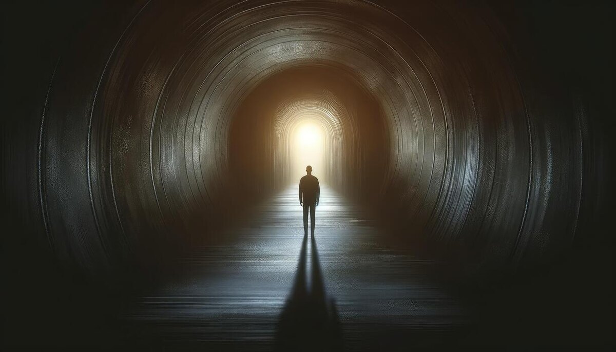 Самый известный образ. Человек чувствует, что проваливается в темный туннель. В конце — яркий, теплый свет.