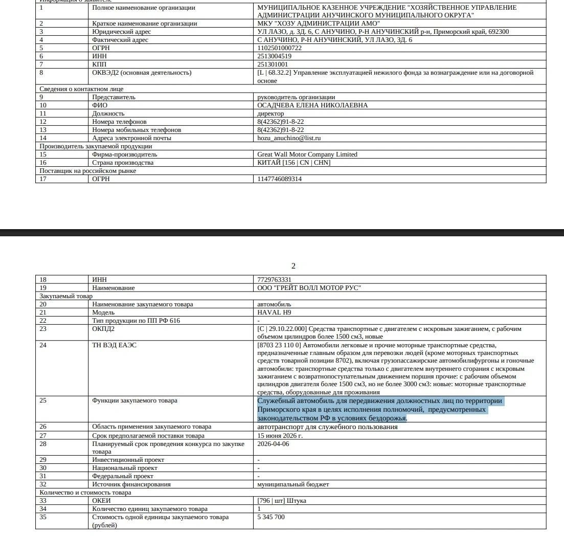 Администрация Анучинского муниципального округа Приморья разместила аукцион на приобретение китайского автомобиля Haval H9 в премиальной