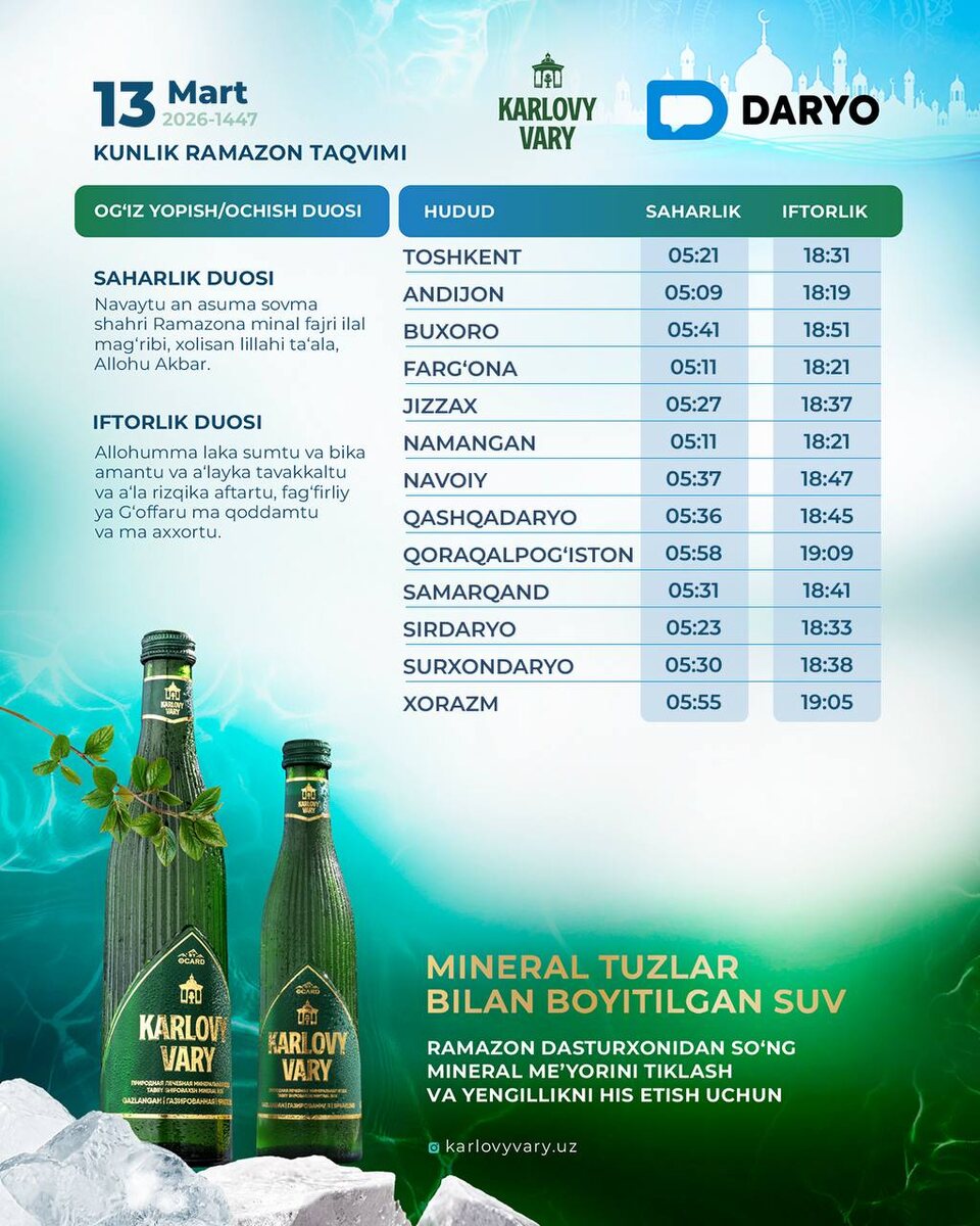 Navaytu an asuvma sovma shahri ramazona minal fajri ilal mag‘ribi, xolisan lillahi ta’ala. Allohu akbar. Ma’nosi: Ramazon oyining ro‘zasini subhdan to kun botguncha tutmoqni niyat qildim. Xolis Alloh uchun Alloh buyukdir. 👉 Obuna bo'ling — @daryo