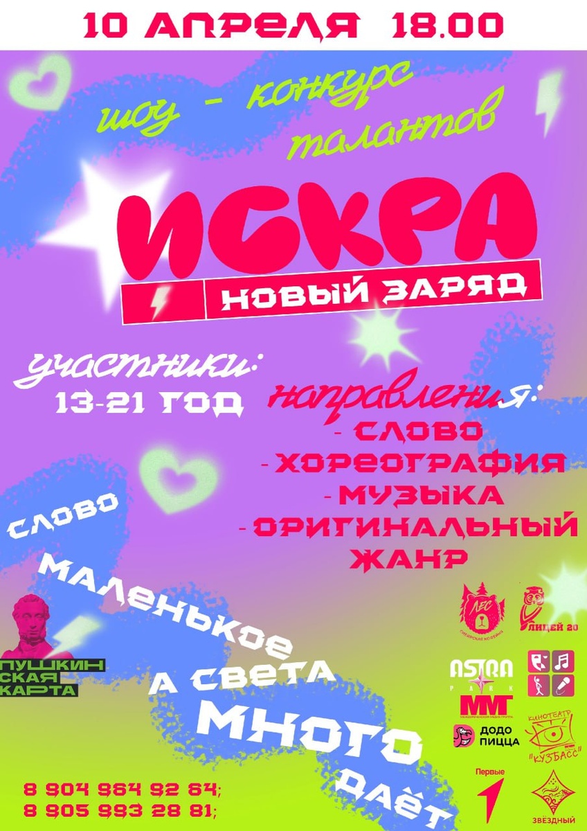 »! Если вы живёте в Междуреченске и хотите проявить себя — этот пост для вас. Совет лицеистов 20 лицея с ДК Распадский открывают приём заявок на участие в конкурсе талантов. Если тебе от 13 до 21, и ты готов зажечь сцену — лови момент! 🎤 Поёшь? 💃 Танцуешь? 🎸 Играешь? 🎭 Владеешь словом? ✨ Или придумал что-то новое? Неважно, новичок ты или профи — «Искра» зажигает всех. Подавай заявку(до 28 марта!). Направления: 🔹 Вокал 🔹 Хореография 🔹 Игра на инструменте 🔹 Художественное слово 🔹 Оригинальный жанр Руководитель проект vk.com/rodi_osha Городская афиша.