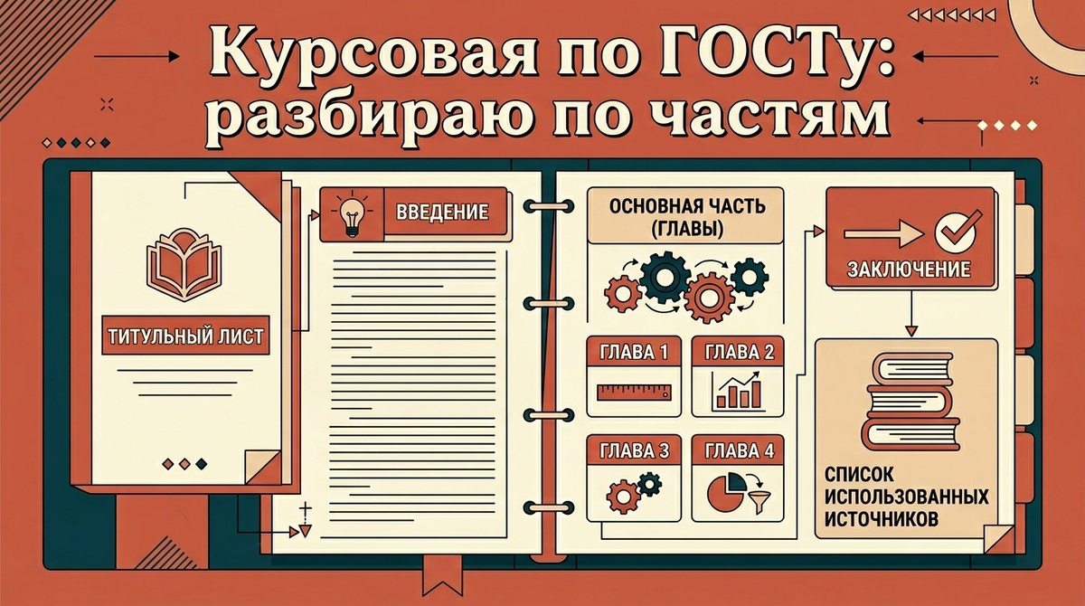 Честно: первые два курса я оформлял курсовые «на глаз». Смотрел на чужие работы, делал похоже. Иногда прокатывало. Потом перестало. Когда я наконец открыл ГОСТ — оказалось, там всего несколько страниц реальных требований. Всё остальное — детали. Разберу, как выглядит нормальный пример курсовой работы по ГОСТу — поблочно, без воды. Первое, что надо настроить — поля и шрифт. Это не ГОСТовский фетиш, а реальная необходимость: распечатанная работа должна нормально читаться и сшиваться. По ГОСТ 7.32-2017: левое поле — 30 мм (под скрепку/переплёт), правое — 10 мм, верхнее и нижнее — по 20 мм. Шрифт Times New Roman 14 pt, интервал 1.5, красная строка 1.25 см. Выравнивание основного текста — по ширине. Заголовки — по центру, без точки в конце. Переносы — отключить. Звучит занудно, но настраивается один раз в шаблоне. Потом не думаешь об этом вообще. В правильном примере курсовой работы по ГОСТу на титульном листе есть: полное название вуза, факультет и кафедра, тема курсовой, дисциплина, ФИО