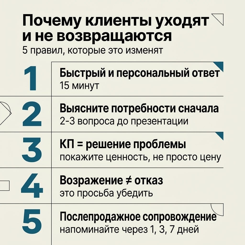 5 правил, которые это изменят 👇 Целый месяц - один вопрос: почему заявки есть, а денег нет? Самое время подытожить. Я выделил 5 ключевых правил продаж, чтобы ни одна заявка не пропала зря. 1️⃣ Отвечайте быстро и персонально. Никаких «Здравствуйте, чем могу помочь». Идеально - ответить в течение 15 минут, упомянуть запрос клиента и сразу задать конкретный вопрос. Скорость и индивидуальный подход на старте - это половина успеха. 2️⃣ Выясняйте потребности клиента прежде, чем презентовать продукт/услугу. Два-три вопроса о задаче, бюджете и ожиданиях клиента - и вы уже знаете, как сделать предложение, от которого сложно отказаться. Стандартный прайс в ответ на первое сообщение быстрее всего убивает интерес. 3️⃣ Коммерческое – не просто цена, это решение проблемы. В коммерческом предложении акцент на выгодах, на языке клиента. Кратко, чётко, с привлекательным заголовком. ➡️ Покажите, что понимаете боль клиента, и предложите конкретное решение + цену. Не перегружайте, но и не оставля