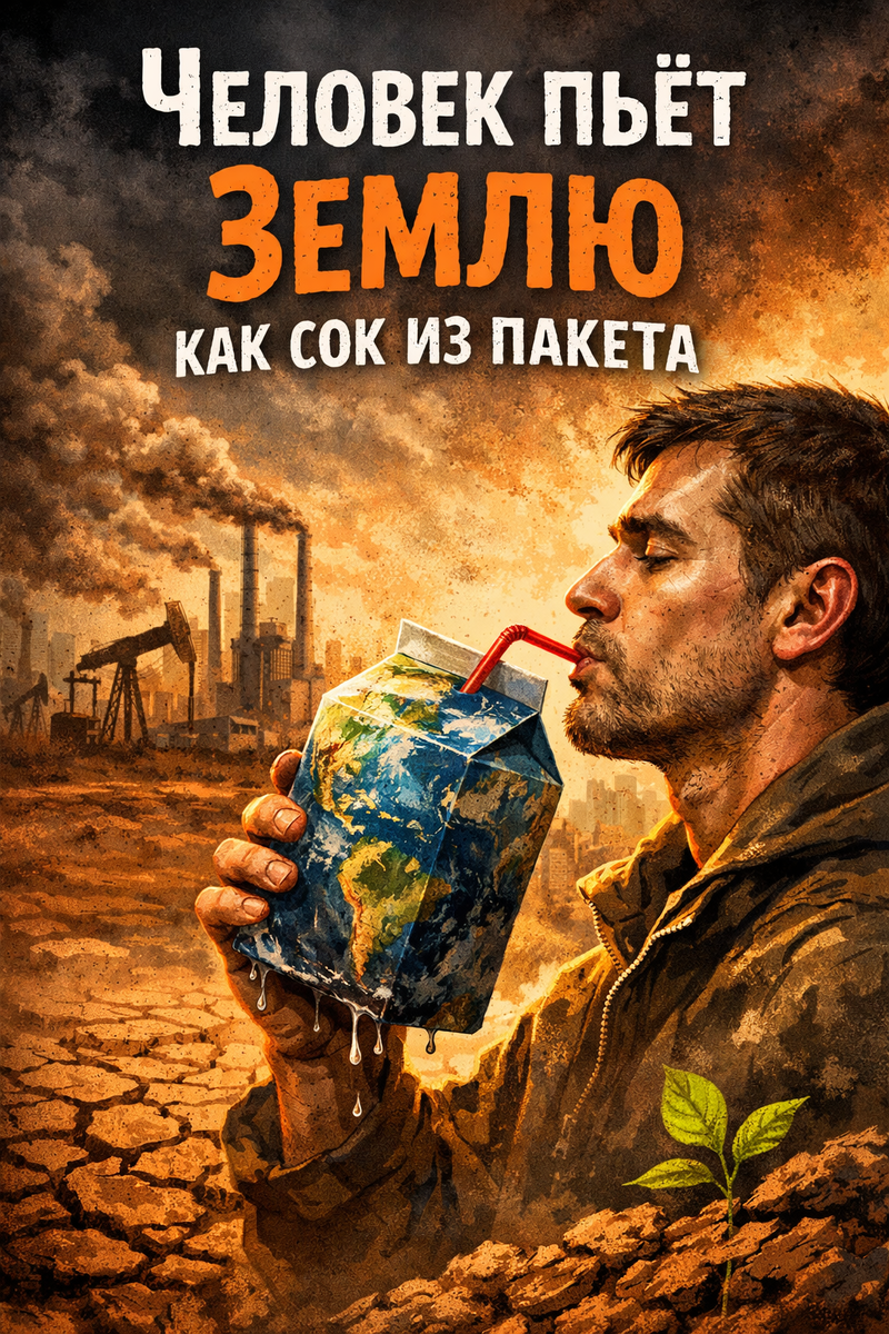 Вся наша жизнь интересная и непредсказуемая. Но есть одна странная вещь: человек часто не замечает глобальной катастрофы. А если и начинает понимать, что происходит, то теряется в собственных мыслях и оправданиях. Ему кажется, что всё хорошо, по крайней мере для него самого. Но на самом деле это может быть совсем не так. Человек — существо маленькое, почти как муравей. Но именно этот «муравей» за тысячи лет сумел построить огромную цивилизацию. Всё начиналось с простого копья, чтобы добыть зверя и выжить. А сегодня мир во многом держится на нефти. Да, есть альтернативы — технологии, экологическая энергия, батареи. Человек растёт, развивается, познаёт науку, и это хорошо. Но в стремлении идти вперёд мы часто забываем о мере. Нам всегда хочется взять больше. Земля похожа на пакет с соком. Мы пьём из него всё больше и больше, не думая о том, что однажды сок может закончиться. И тогда внутри останется только пустота и засуха.
