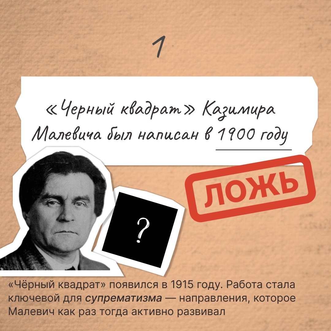 ❕ 🔍 Проверим, какой факт об известных художниках оказался ложным? Ответ уже в карточках. 🪄 Вопрос для вас: как вы думаете, какую тайну скрывает знаменитый «Чёрный квадрат» Малевича?