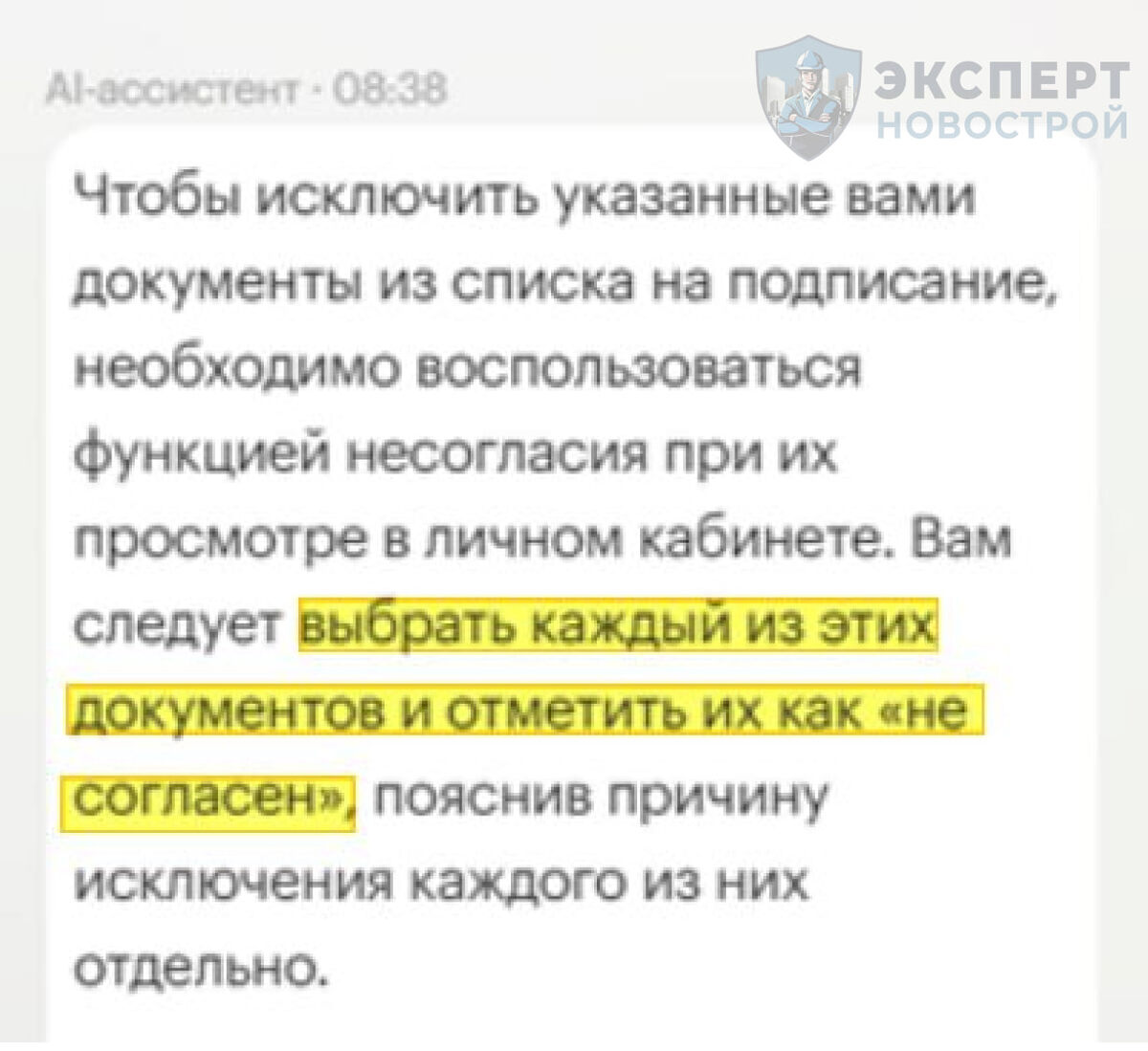 Теперь ПИК может ОТКАЗАТЬСЯ убирать эти допники из пакета на электронное подписание! И вы оказываетесь в ловушке: квартиру надо принять, но подписывать то, что лишает вас неустойки и права на компенсацию, вам не нужно. Что делать, если ПИК отказывается удалять лишние допники? 4 рабочих варианта: 1. Официальное несогласие В личном кабинете при просмотре документа нажмите кнопку "Не соглашаюсь", как это рекомендует сам ПИК. (*Смотри скриншот). Если принимаете очно с участием представителя застройщика, то лично просите его не давать на подпись лишние документы. 2. Твердая позиция Пишите в чат поддержки или говорите представителю лично: "Я не буду НИЧЕГО подписывать, пока лишние документы не уберут". "Я не обязан подписывать никакие доп.соглашения, это нарушает мои права". Застройщику нужно передать вам квартиру, сроки идут, капает неустойка. Рано или поздно он отступит. 3. Выборочное подписание документов через Госключ Отправьте документы на подпись в Госключ (или другую систему). Там по