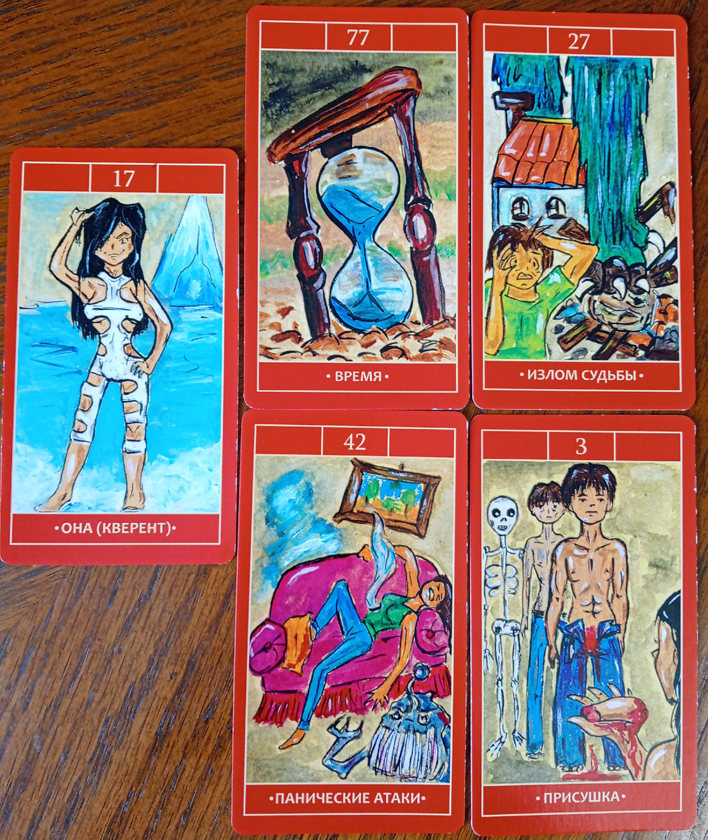 Вышли карты: "Время", "Излом судьбы", "Панические атаки", "Присушка". Ваш враг страдает от панических атак, причина - стрессы, проблемы и тяжёлые жизненные обстоятельства. Ваш враг либо боится находящихся рядом с ней людей, либо боится, что её бросят. Страх так же сказывается и на работе. Из-за страха она совершает серьёзные ошибки, что недопустимо на работе, из-за недоверия к людям, которые с ней работают, портятся отношения с людьми. В здоровье: повышенное потоотделение; дрожь, озноб; одышка и чувство нехватка воздуха; удушье; головокружение; онемение конечностей и чувство "мурашек" на коже; страх умереть; страх сойти с ума или совершить необдуманный поступок. На Вашего врага навели магическое воздействие, так показывают карты: "Излом судьбы" и "Присушка". Как это сказывается на её жизни? "Излом судьбы" схож с Крадником, то есть ей хотят сломать судьбу и она теряет всё, чем владела ранее. В её жизни пошли цепочки неудач, она стала замечать, что стремительно падает на дно во всех жизн