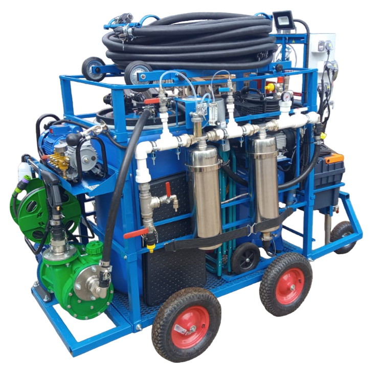 В комплект вошли не только основные модули, но и богатый ЗИП-кейс, шланги, кабели, стулья для операторов и водонепроницаемый чехол