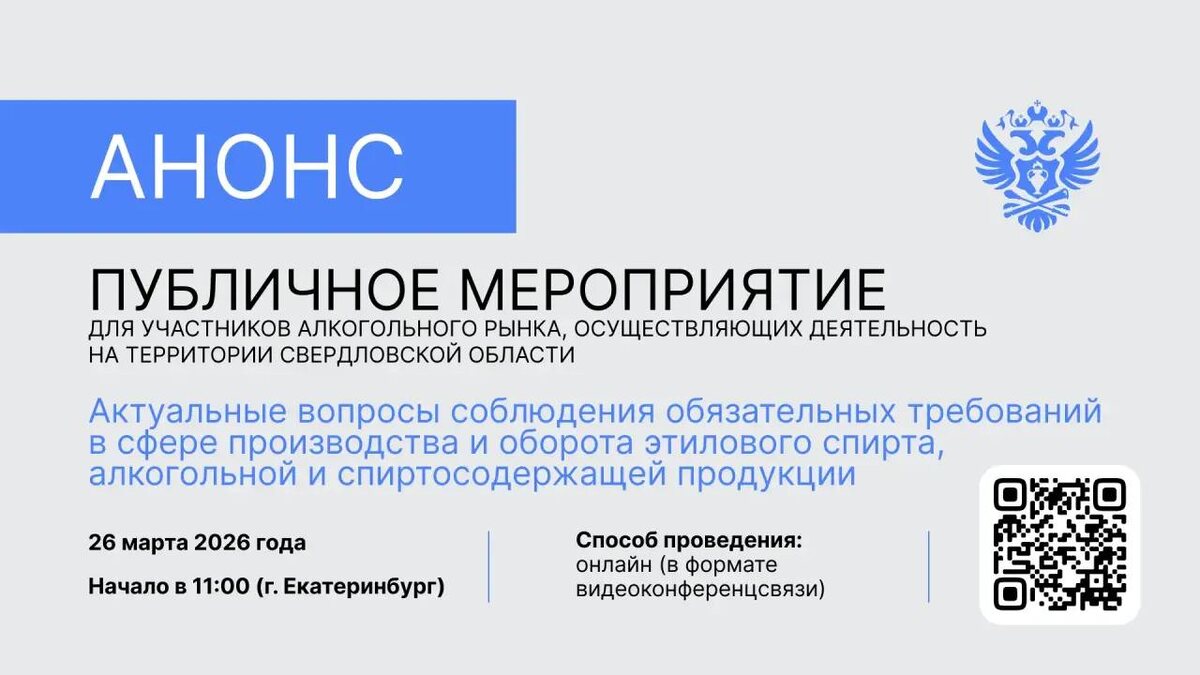 , что 26 марта 2026 года в 11:00 (г. Екатеринбург) планирует проведение публичного мероприятия. ▶️ Тема мероприятия «Актуальные вопросы соблюдения обязательных требований в сфере производства и оборота этилового спирта, алкогольной и спиртосодержащей продукции». Публичное мероприятие состоится в режиме видеоконференции для организаций Свердловской области. ▶️ Подробнее о мероприятии и регистрации на сайте: https://clck.ru/3SVyXV #Анонс #УрФО Росалкогольтабакконтроль МАХ | ВКонтакте | Telegram