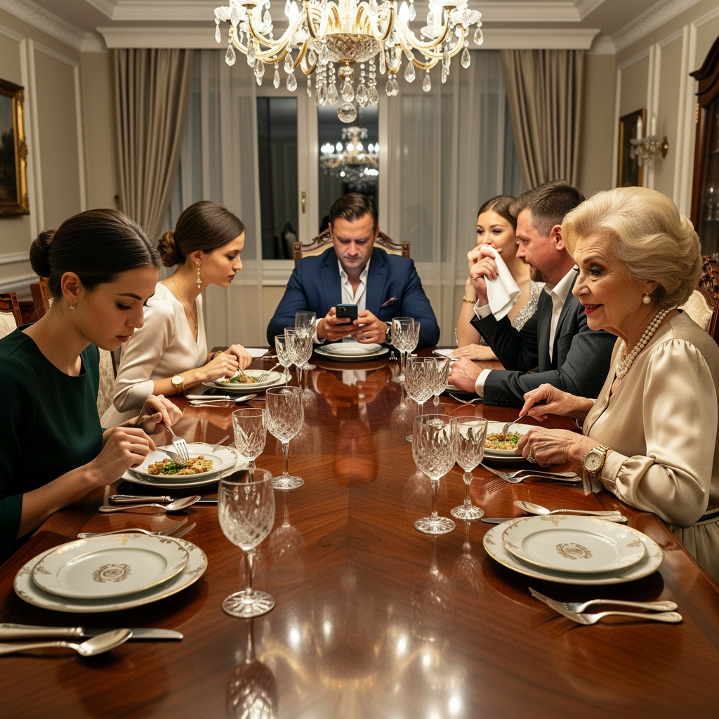 Они сидели за огромным столом из красного дерева, и каждый его сантиметр кричал о деньгах. Столовое серебро, хрустальные бокалы, фарфор с вензелями — все было настоящим, дорогим и… мертвым. Как и разговоры за этим столом.