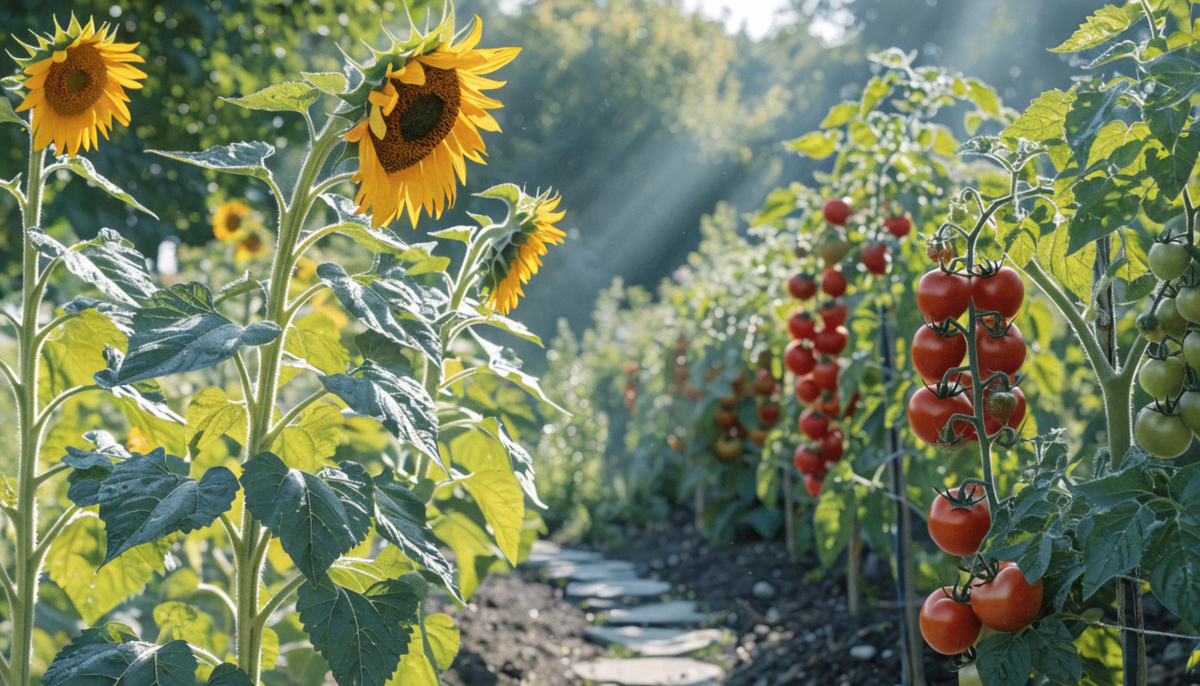 Ещё один приём — использование высоких культур как живых экранов. Кукуруза или подсолнух с южной стороны грядки создают мягкое притенение для салатов и зеленных культур во второй половине дня. Никаких дополнительных конструкций, только грамотное соседство.