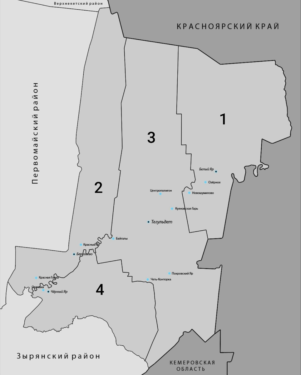 Согласно Закону Томской области от 09.09.2004 № 197-ОЗ «О наделении статусом муниципального района, сельского поселения и установления границ муниципальных образований на территории Тегульдетского района» в состав муниципального образования «Тегульдетский район» входят 4 сельских поселения, объединяющие 14 населенных пунктов. Численность населения Тегульдетского района на 1 января 2026 года 5019 человек! 1. Белоярское сельское поселение