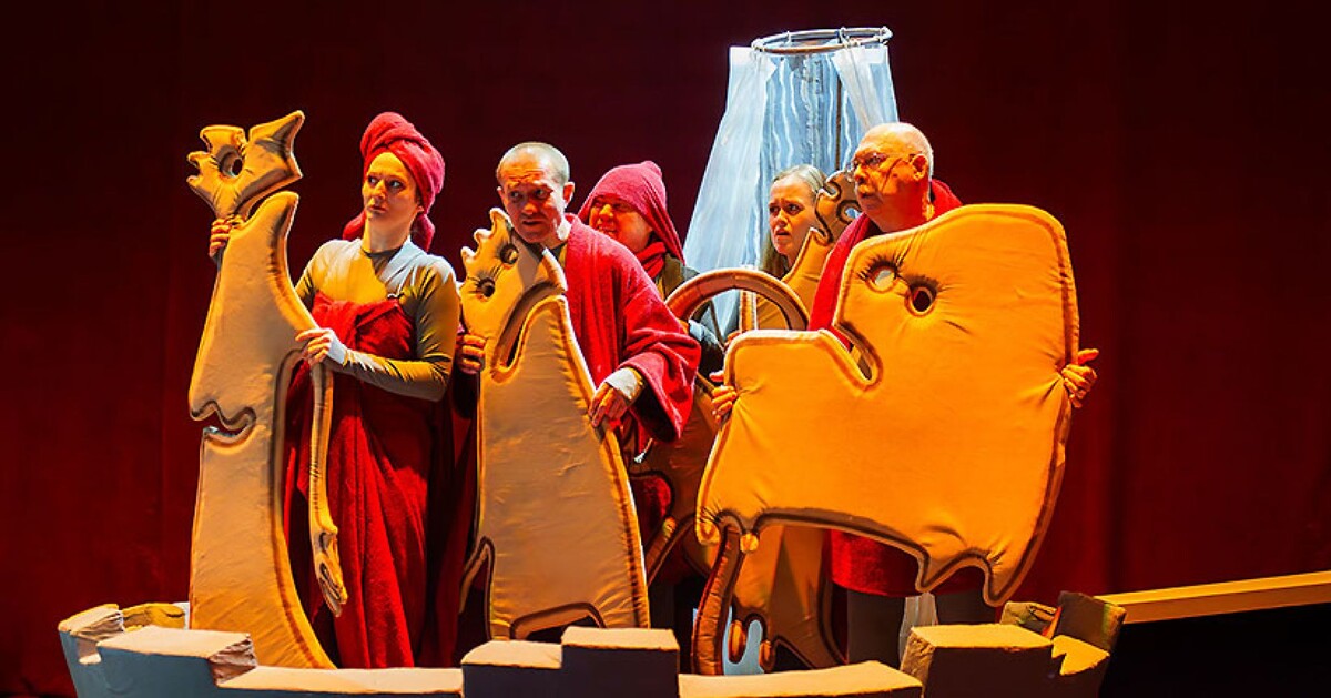 Новосибирский театр кукол в лице петербургского режиссёра Наташи Слащёвой переписал хрестоматийного «Гамлета», попытавшись уйти в психологию семейной жизни. Здесь «сыночка-корзиночка» Гамлет страдает посттравматическим стрессовым расстройством после таинственной гибели отца, Гертруда наконец-то обрела женское счастье в объятиях Клавдия, а Офелия живёт в иллюзорном коконе наивных мечтаний, который подозрительно напоминает душевую занавеску. На этот раз автор прекрасного спектакля «Про Ёжика и Медвежонка» вышла в пространство дерзкого арт-хауса (насколько это возможно в детском театре), где шекспировские герои жарятся на адовой сковородке токсичных семейных взаимоотношений, разыгрывая канонический сюжет на кухне.